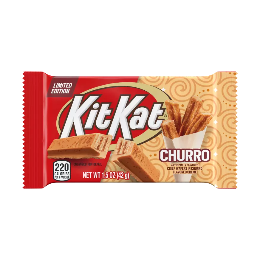 KIT KAT® Churro Flavored Candy Bar takes inspiration from a beloved dessert enjoyed in many corners of the world. This limited-edition flavor features buttery churro-flavored creme with sugar around crisp wafers. (42g)